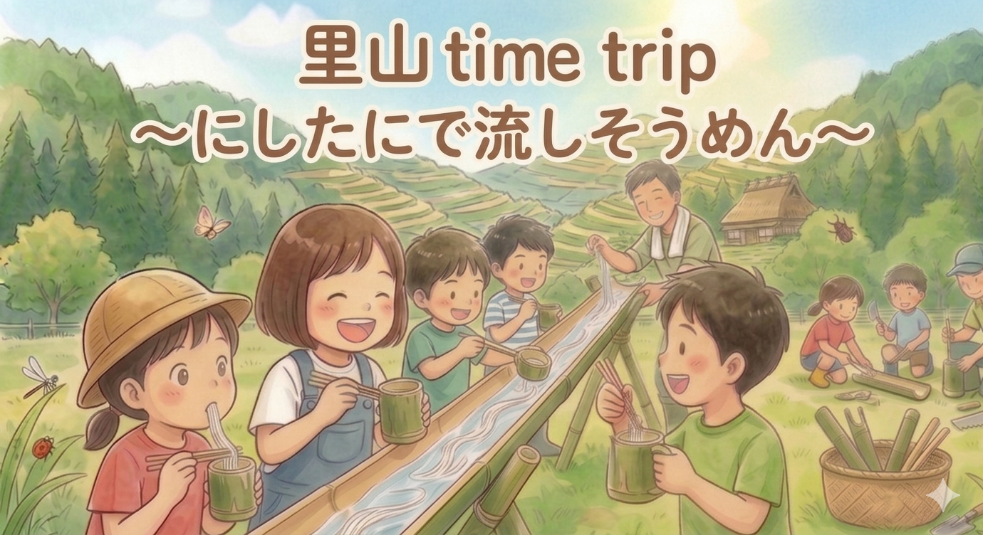 電車とバスで西谷へ。竹を割って切って、みんなで準備するところから始まる、夏休みの思い出に残る一日です。