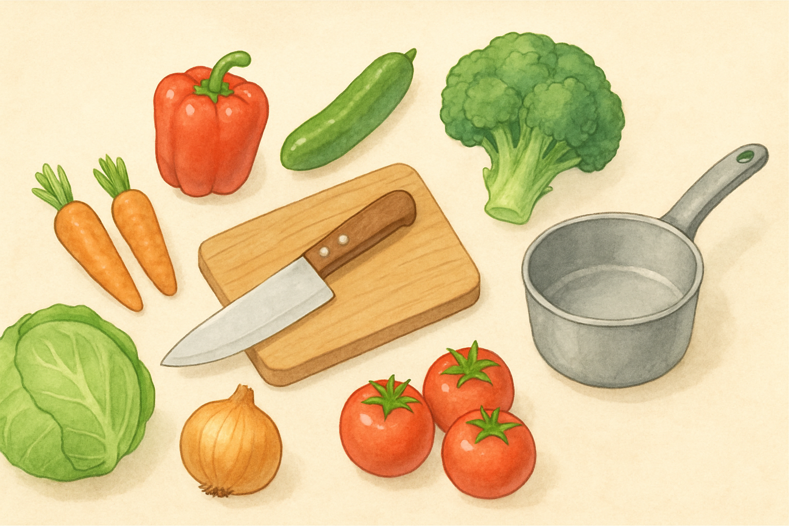 持ち物:エプロン・三角巾・マスク・手ふき用タオル・布巾・筆記用具
