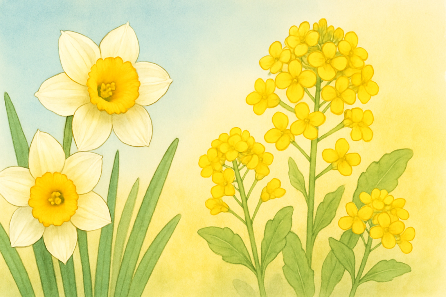 水仙や菜の花が、月明かりを浴びてほのかに光っている。風が吹くたびに一斉に揺れ、まるで何千もの小さな灯が息をしているように見えた。